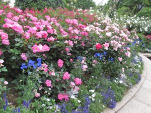 ▲ノックアウト・シリーズに、青や紫の草花を組み合わせた花壇