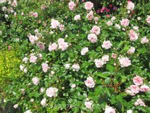 このバラの両親は(The Fairy × New Dawn)。「ザ・フェアリー」は、淡いピンク色の、ポリアンサ系統を代表する修景バラです。「ニュー・ドーン」は、殿堂入りもはたしている淡いピンク色で強健なつるバラの名花。この両親で、優秀な子が生まれないわけがない!