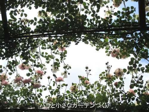 上の写真は、大型アーチに誘引したニュー・ドーンを下から見上げたところです。花枝が長いのがよく分かりますね。