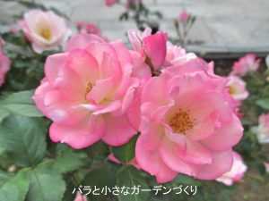 四季咲中輪系「桜霞」の枝変り。可憐な桃色の小花が次々咲くつるバラ。